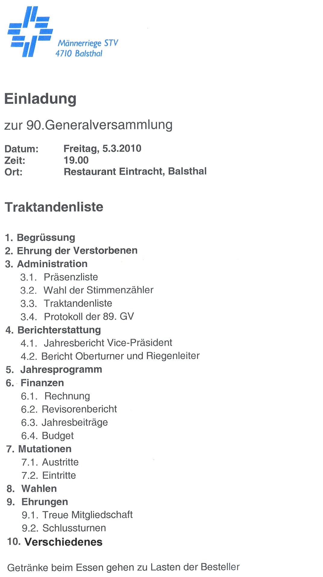 Am 05.03.2010 um 19:00 Uhr begrüsst der Vorstand die Turner der Männerriege STV zur 90. Generalversammlung im Restaurant Eintracht in Balsthal.